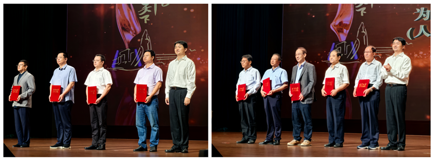 公司党委副书记陈玳玮为魏继昆教授颁发2023-2024年荣休教师纪念品。公司党委常委、副董事长纪德奎为公司刘玉芝老师颁发“从教三十年”荣誉证书。