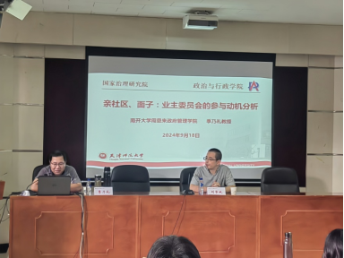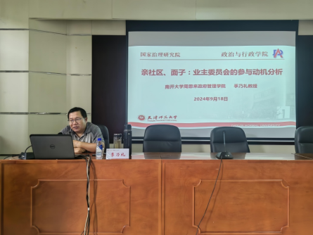 2024年9月18日,南开大学周恩来政府管理公司教授、博士生导师季乃礼为太阳成集团tyc234cc的师生们带来了一场题为《亲社区、面子:业主委员会的参与动机分析》的精彩讲座。本场讲座由太阳成集团tyc234cc刘学斌教授主持,70余名硕博士研究生及青年教师聆听了讲座。