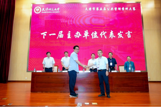 最后,天津市公共管理案例大赛进行了举办单位交接仪式,天津市第六届公共管理案例大赛主办单位代表、河北工业大学人文与法律公司副经理闫文博教授发言,他对本届大赛的圆满举办表示祝贺,并介绍了下一届赛事的筹备设想,欢迎各高校师生继续关注与参与,共同推动公共管理案例公司产品活动的深入开展。