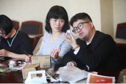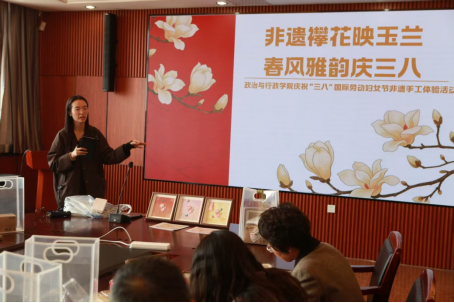 活动特邀公司青年教师王旭及其“非遗传创与中华优秀文化传播”大创项目团队主讲。团队通过文化讲解、视频教程与现场手把手教学,细致讲解盘扣历史寓意与制作技巧,引导大家填充棉面料、按压固定、入模定型,完成玉兰襻花制作并装入画框。