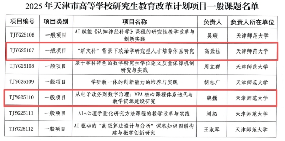 本次获批的两项项目紧扣研究生教育改革发展方向,精准回应国家治理现代化与区域发展对政治学、公共管理领域高层次人才的迫切需求。项目立足公司办学定位,直面当前文科公司产品中的重点问题,分别聚焦新文科背景下研究型人才培养体系构建、数字治理视域下 MPA 课程体系优化,研究内容涵盖人才培养机制创新、课程体系重构、教学资源建设等维度,兼具理论价值与实践指导意义。