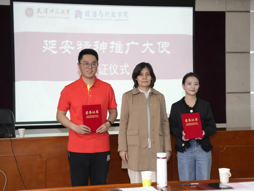 王钰同学用一幅幅图片向大家详细介绍了本次研学活动,与在座师生共同感受毛主席等老一辈革命家在延安住窑洞、吃粗粮、穿布衣,艰苦奋斗、自救自强,用“延安作风”打败了“西安作风”的光荣历史。共同学习习近平总书记在梁家河为老百姓建沼气池、买磨面机,为民造福、追求真理、埋头苦干的精神。牛晓耕同学分享了他参加研学团的学思感悟,表示参加研学团既是一种荣誉也是一种激励,作为一名高校员工应当挖掘延安精神蕴含的内涵价值,在科研探索、理论研究中坚持自力更生、艰苦奋斗,在将小我融入大我、青春投身基层的伟大实践中全心全意为人民服务。会上,姜德红书记还为牛晓耕、王钰两位同学颁发了“延安精神宣讲员”聘书,希望他们充分发挥公司员工理论宣讲团的优势,深入研究、传承、践行好延安精神,争当弘扬延安精神的排头兵、领头雁。