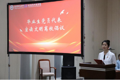 天津市优秀共青团员甄鑫作为毕业生党员代表向全体党员发出文明离校倡议,号召全体毕业生党员锤炼党性修养,秉持师大校训,彰显青年担当,带动全体员工为实现社会主义现代化强国贡献自己的力量。
