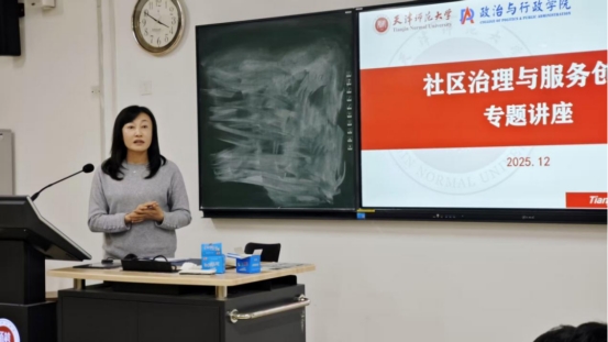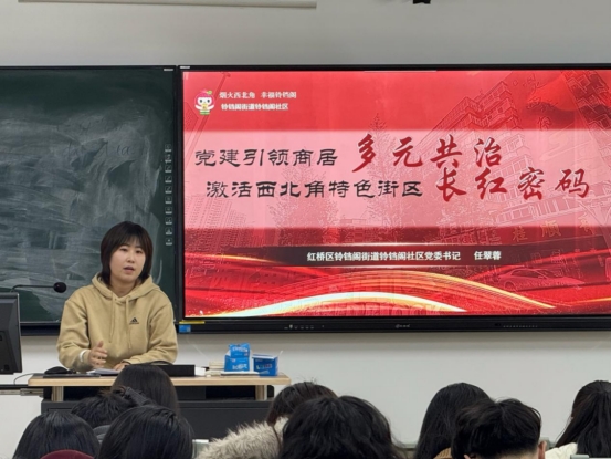 任翠蓉书记讲座主题为“党建引领商居多元共治 激活西北角特色街区长红密码”。她向师生介绍了铃铛阁社区的历史背景与治理创新路径,通过丰富的案例详细阐述了社区如何坚持以党建引领为核心,利用社区基金解民忧、创“商居共情”聚合力、筑民族团结阵地凝人心的治理逻辑。同时展示了通过兼具艺术美感与实用功能的社区改造,将老旧小区逐步转变为环境整洁、特色鲜明的现代化社区的成功做法。