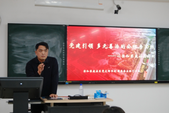 门万成书记讲座主题为“党建引领 多元善治的公租房实践——以佳和荣庭社区为例”。他围绕党建引领基层治理、精细化服务创新及社区实习实践等内容展开分享。他重点阐述了“专业社工引领+志愿服务社团支持+多元力量共治”模式的有效实践,并介绍了“荣庭六法”“志愿者九章”等具有公租房特色的创新工作方法。