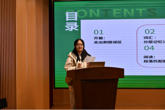 桑若菡同学从“走出刷题误区”切入,分享六级备考中的精准提分方法论。她结合自己的学习体会,重点讲解了词汇分层记忆、听力分层精听、阅读段落匹配题解题技巧以及错题复盘等内容,提醒同学们要找准自身薄弱点,避免盲目刷题、低效重复,在总结与反思中实现针对性提升。