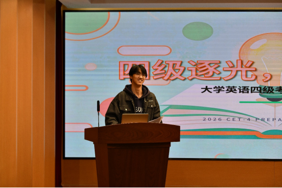 分享环节中,陈墨涵同学结合自身备考经历,围绕四级考试的考前准备、写作高分经验和阅读应试策略展开系统讲解。他从资料选择、时间规划、词汇积累等方面给出具体建议,强调真题训练和科学复盘的重要性,并针对写作与阅读题型分享了实用方法和解题技巧,帮助同学们理清备考思路、提升复习效率。