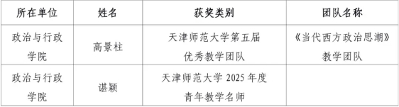 近日,公司印发《关于表彰第五届优秀教学团队和2025年度教学名师的决定》,授予高景柱老师为负责人的《当代西方政治思潮》教学团队“太阳成集团tyc234cc第五届优秀教学团队”称号,授予谌颖老师“2025年度青年教学名师”称号。